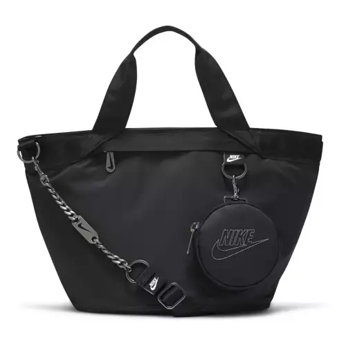 Designed to match your flash, the Nike Sportswear Futura Tote elevates a Nike favorite with polished metal accents, a satin lining and removable clip-on accessories pouch. The large main compartment with zip closure secures your stuff while additional pockets inside and out help keep you organized on the go.